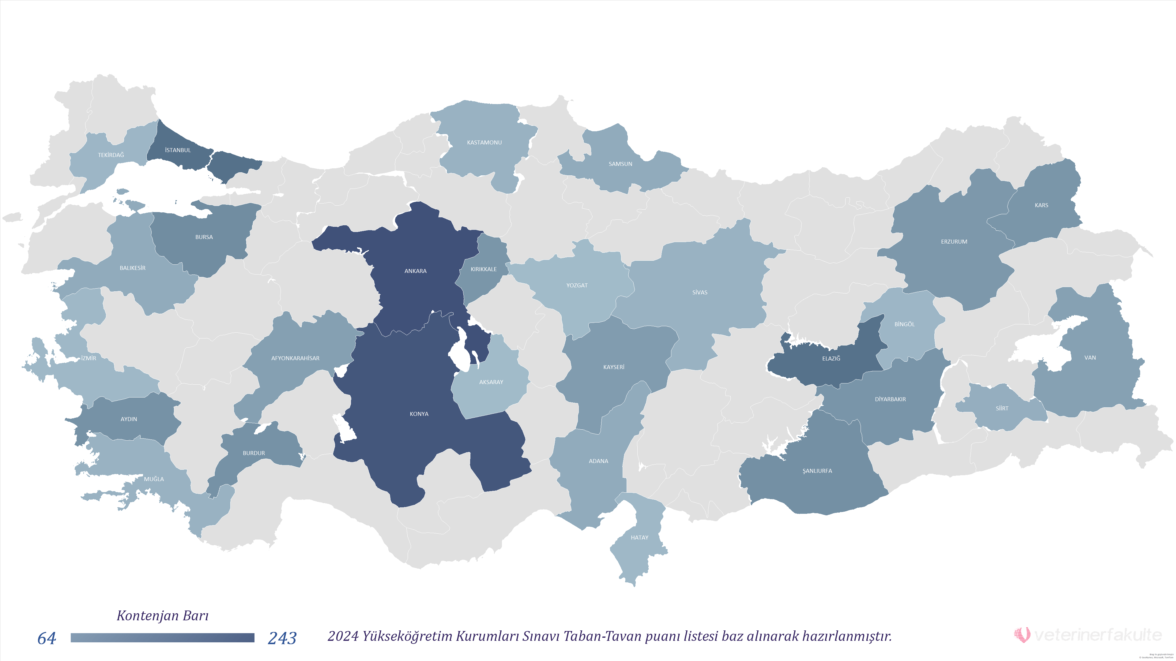 2024 Yükseköğretim Kurumları Sınavı sonuçlarının açıklanmasıyla beraber, tüm fakültelerin bölümlerine yönelik taban ve tavan puanlar netlik kazandı. Sayısal puan türüne göre öğrenci kabul eden veterinerlik fakültelerinde, ücretli ve burslu programlara ayrılan toplam 2859 kişilik kontenjanın tamamı doldu. Bir önceki yıl kontenjanının 2590 olduğu (bkz. 2023 Taban ve Tavan Puanları) hesaba katıldığında,bu durum 269 kişilik bir kontenjan artışı olduğunu ortaya koymaktadır. Ayrıca okul birincisi kontenjanından (81), depremzede aday kontenjanından (104) ve 34 yaş üstü kadın kontenjanından (52) olmak üzere toplamda 3096 öğrenci veterinerlik fakültelerine yerleşmiştir.